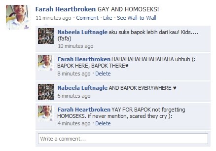 - Hey, i know it's over and done with, but i'm still not happy with you, seriously. I don't know you personally, and i've never talked to you at all. Suddenly you appear at my wall and hate comment about me, what is this? Don't call me vain and boast that you're in the top class in Primary 6 and all that shit. Plus, it's my personal wall, and you're not invited to enter. I may just delete you, good idea? Yeah, i think so. Sayonaraz, bitch!